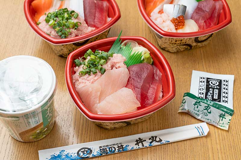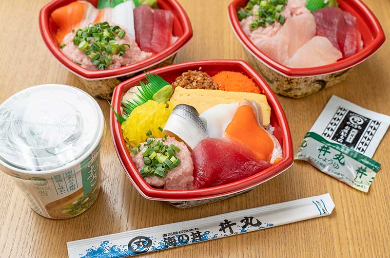 丼丸大将 清水船原店は、記念塔通り沿いにある海鮮丼の専門店です。100種類を超える丼メニューをご提供しており、テイクアウトが可能です。丼丸の海鮮丼は、豪華な魚介が丼いっぱいに敷き詰められ、味もボリュームも大満足の逸品!海鮮丼の他にも手巻き寿司やいなり寿司、お刺身等もございます。食卓の「もう一品」としてもお買い求めください。ご来店をお待ちしております。